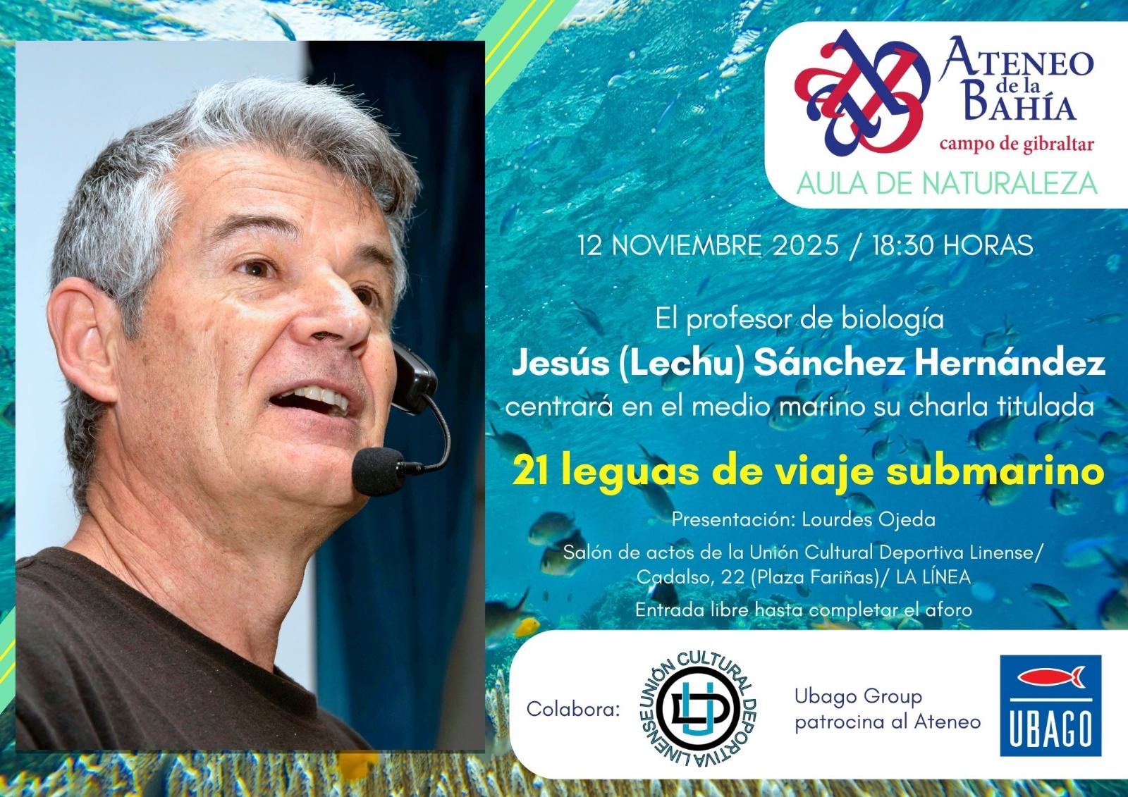 El Aula de Naturaleza del Ateneo de la Bahía nos proporcionó un encuentro con el profesor de biología Jesús Sánchez Hernández (Lechu), quien nos propuso en su charla un acercamiento a la vida submarina a lo largo de las 21 leguas de litoral que comprende el Campo de Gibraltar. Además del aparato descriptivo desplegado por Lechu, su compromiso con la protección del medio natural vibró entre los asistentes como un poderoso llamamiento a la concienciación colectiva contra la galopante destrucción de las cadenas tróficas que equilibran nuestros ecosistemas.