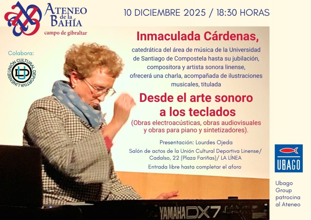 El Ateneo de la Bahía vuelve a vestirse de gala, y esta vez lo hace con la presencia de Inmaculada Cárdenas, una artista sonora de alcance internacional, nacida en La Línea, y que en La Línea reside a tiempo compartido con sus temporadas en Galicia. Inmaculada nos va a poner en contacto con unos planteamientos experimentales que amalgaman sonido, imagen, improvisación y otros elementos capaces de convertir cada pieza en una fascinante exploración creativa. Más que oír música, casi diríamos que vamos a ver sonidos, a participar de una ceremonia indagatoria que tanto tiene de fantasía lúdica como de profundización sensible. Las explicaciones y el sintetizador de Inmaculada Cárdenas nos invitarán a una tarde electroacústica que nos puede resultar muy novedosa.