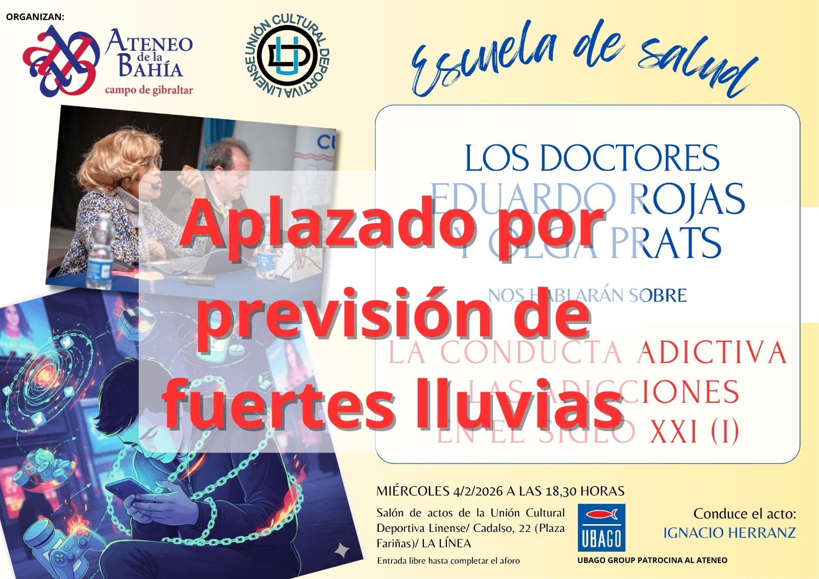 El mundo actual, con sus dosis diarias de hiperinformación y la falta de sosiego, con su competitividad y urgencias, con sus pensamientos a la carta capaces de enmohecer el espíritu crítico, con la sobrecarga de estímulos publicitarios y el consumismo agresivo, etc., etc., va generando frustraciones que el ser humano no siempre acierta a compensar adecuadamente. A las adicciones típicas, como drogas o alcohol, se van sumando necesidades de recompensa inmediata que las más de las veces nos encadenan a dependencias extremadamente peligrosas también, pese a su apariencia inocente. Videojuegos, compras, redes sociales, televisión, mal gestionados, pueden convertirse en el enemigo diario e insospechado, incluso en portales cotidianos hacia la alienación. De todo ello nos van a hablar los doctores Rojas y Prats en la próxima sesión de la Escuela de Salud. Unión Cultural Deportiva Linense y Ateneo de la Bahía os esperan el próximo 4 de febrero a las seis y media de la tarde.